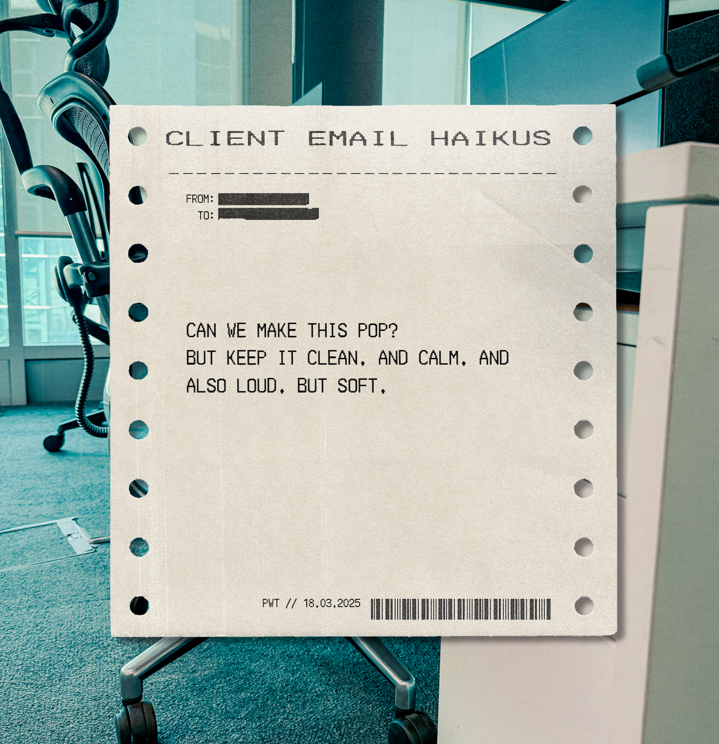 "Decoding client emails is an art form. Sometimes, it feels like reading Japanese poems. Cryptic, poetic, and wildly open to interpretation. So I turned them into actual Haikus. A playful, tongue-in-cheek series that resonated with every creative who’s ever hit ‘Reply.’